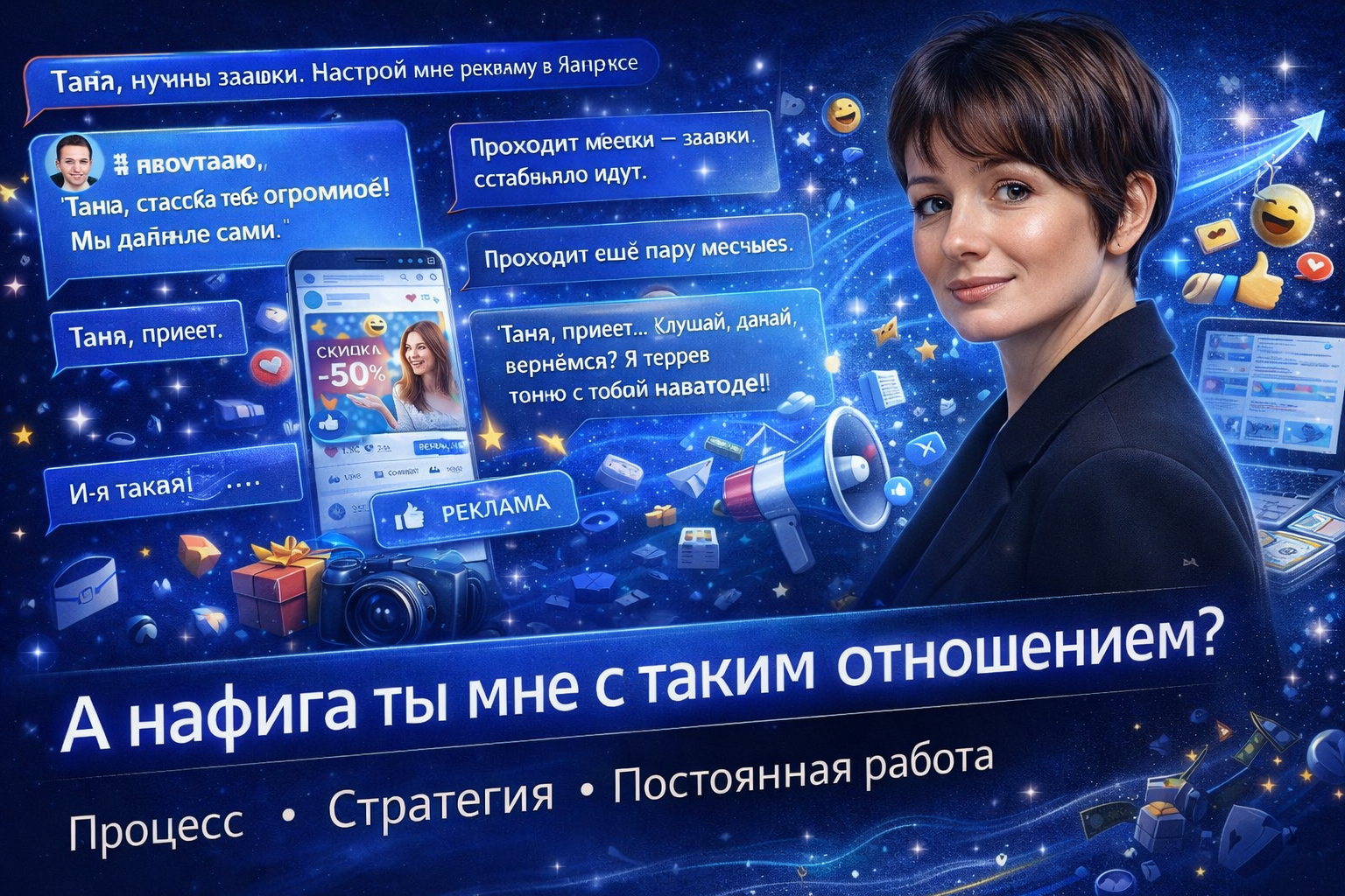 — Таня, привет… Слушай, что-то реклама перестала работать. Заявки подорожали, конверсии упали, конкуренты давят. Давай вернёмся? Я теперь точно с тобой навсегда!