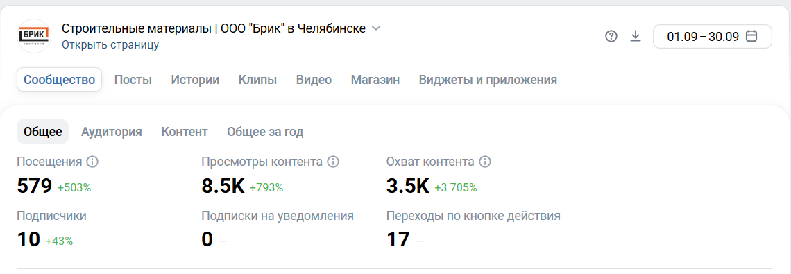 * Изменила название группы ВКонтакте на высокочастотный запрос «Строительные материалы | ООО «Брик» в Челябинске»